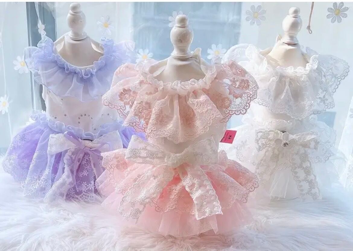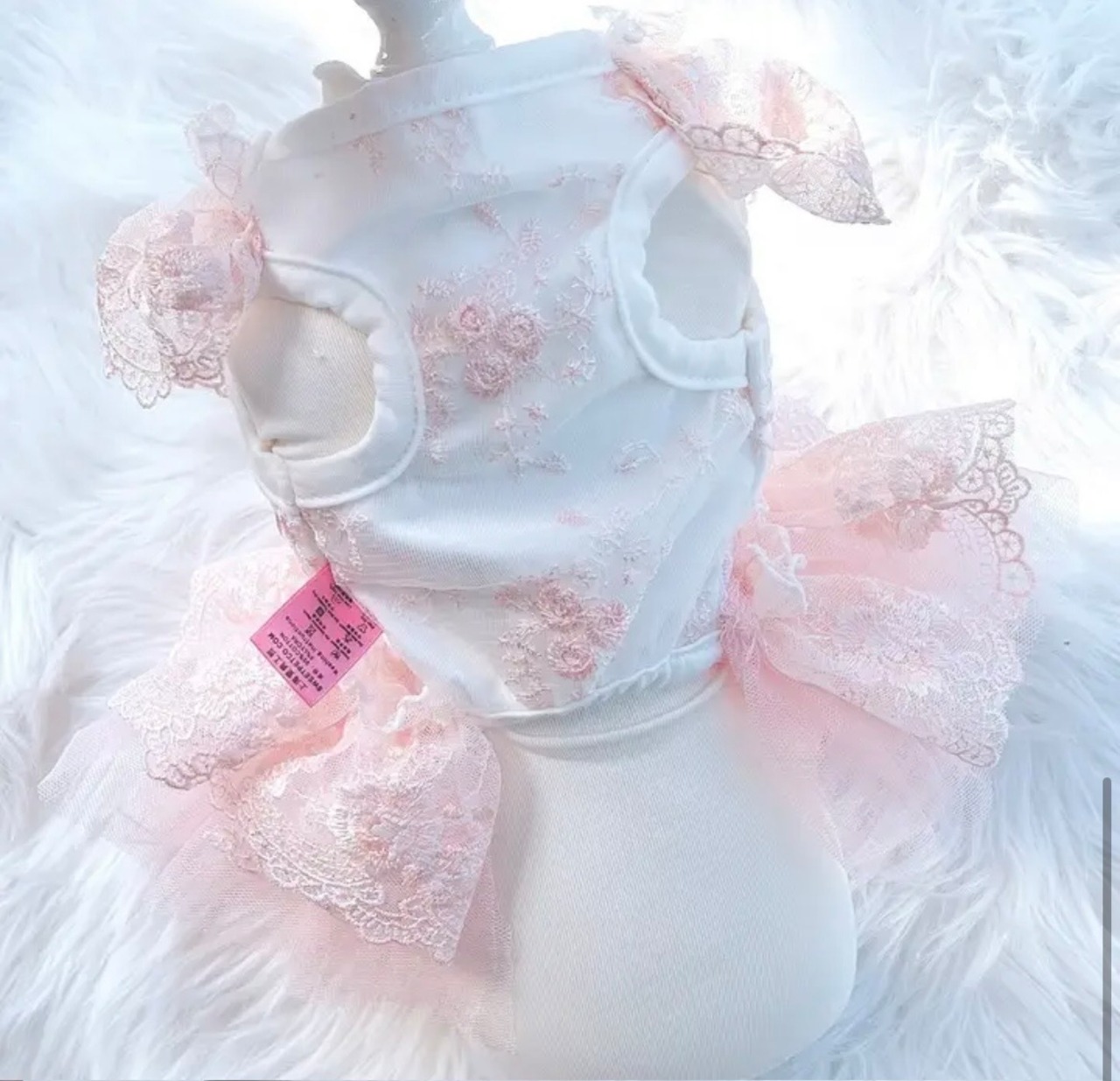 ピンクのレースが可愛い、ペットのためのアニバーサリー用ドレスです。